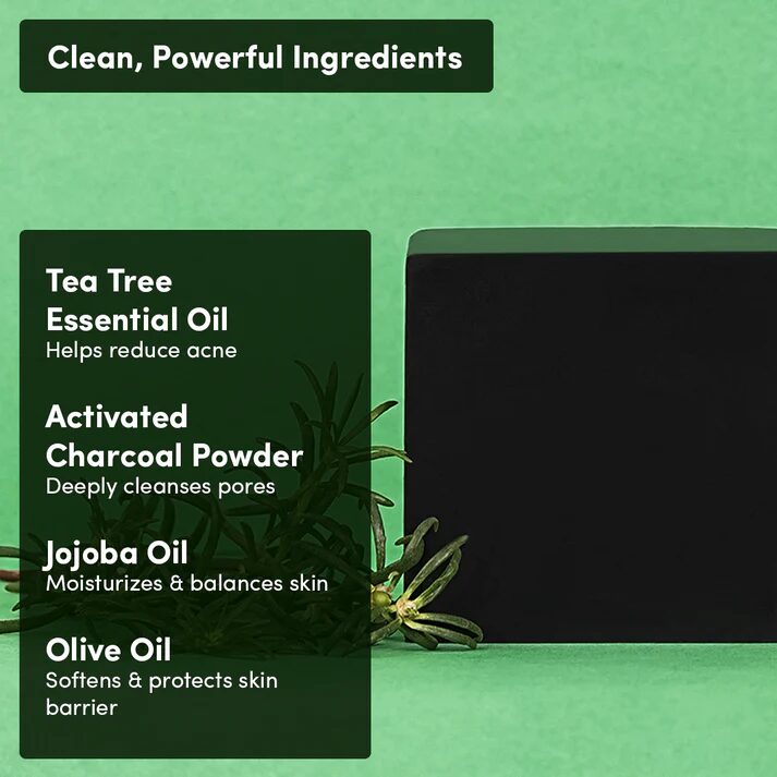 SLS-Free Soap Base, Tea Tree Essential Oil, Coconut Oil, Activated Charcoal Powder, Olive Oil, Castor Oil, Sugar