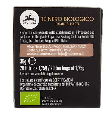 Alce Nero bologic black tea is a blend of highly selected black teas with a deep, intense and pleasantly aromatic taste. Black tea (a plant of origin Camellia Sinensis) is the most widespread and well-known in the West. Alce Nero organic black tea is a fine selection of black tea from the plantations of India that preserves all the aroma and taste typical of the plantation.