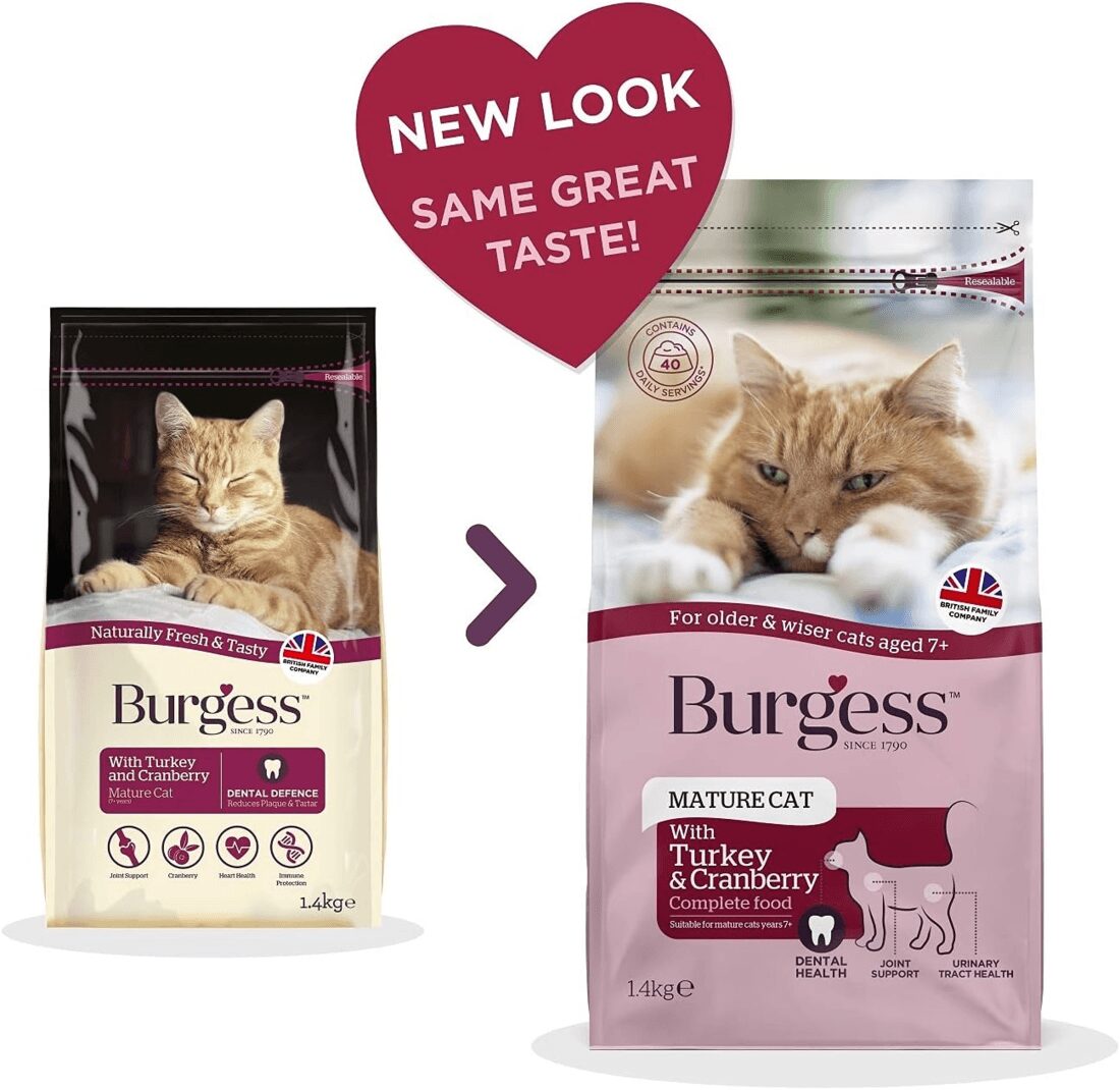 Burgess Matured Cat Turkey & Cranberry is a complete dry cat formula for mature cats over 7 years old. It has a specialized ingredients that help with the reduction of plaque formation and support teeth and gums.