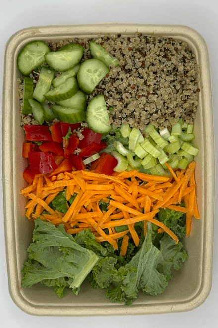 Organic Kale, Organic Tri-color Quinoa, Organic Grated Carrots, Organic Cucumber, Organic Red Bell Peppers, Organic Celery