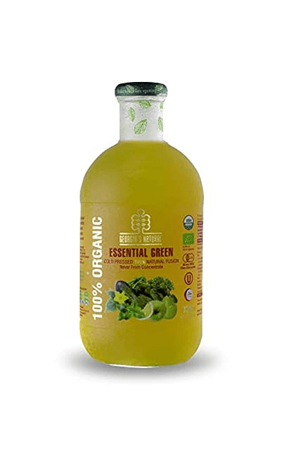 Cold-pressed organic green juice made from fruits and veggies, rich in vitamins and antioxidants.