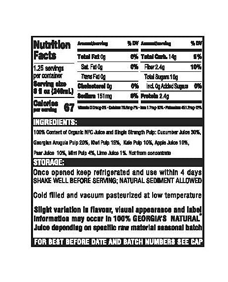 100% Content of Organic NFC Juice and Single Strength Pulp: Cucumber Juice, Georgian Arugula Pulp, Kiwi Pulp, Kale Pulp, Apple Juice, Pear Juice, Mint Pulp. Lime Juice