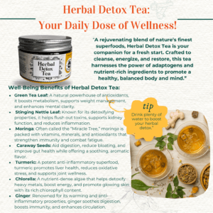 Herbal Detox Tea is a refreshing blend of green tea and powerful herbs, thoughtfully crafted to support your body’s natural cleansing process. Featuring ingredients like stinging nettle, moringa, and turmeric, this infusion helps your liver and kidneys work efficiently while offering a soothing, earthy flavor