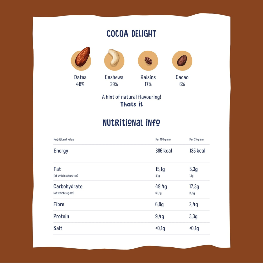 Dates 48%, Cashews 30%, Raisins 16%, Cocoa 6%, A hint of Natural Flavouring
