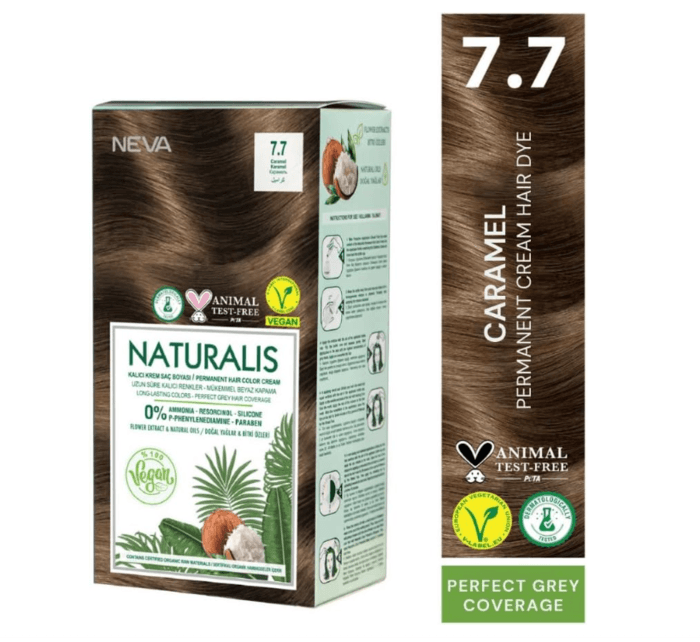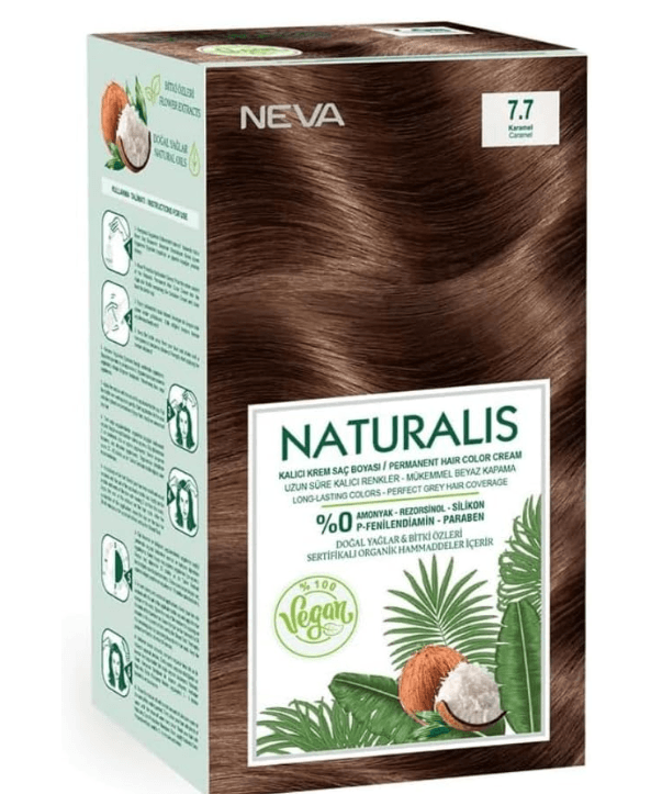 NEVA Naturalis Permanent Hair Dye Set, Vegan,100% Gray Coverage, Organic, No Harmful Chemicals, GMO-Free, Long-Lasting Shine – CARAMEL – 7.7