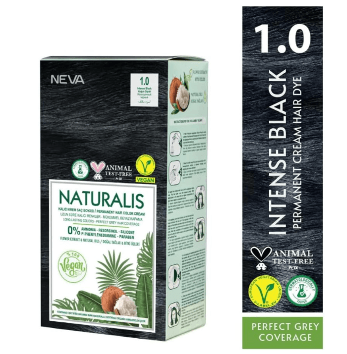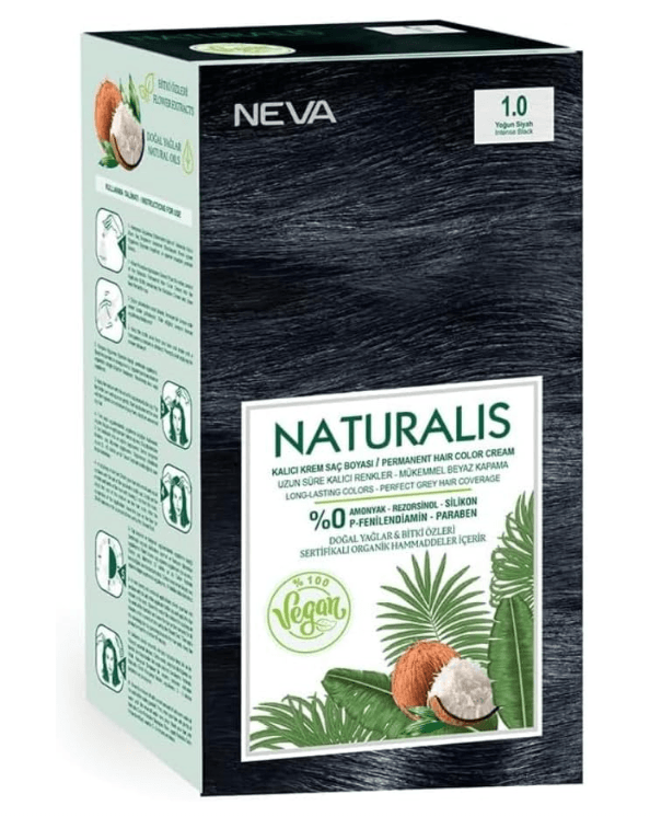 NEVA Naturalis Permanent Hair Dye Set, Vegan,100% Gray Coverage, Organic, No Harmful Chemicals, GMO-Free, Long-Lasting Shine, Intense Black 1.0
