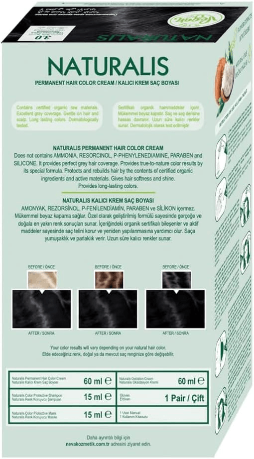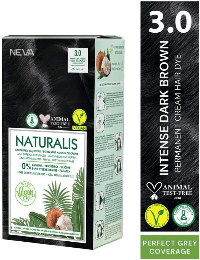 NEVA Naturalis Permanent Hair Dye Set, Vegan,100% Gray Coverage, Organic, No Harmful Chemicals, GMO-Free, Long-Lasting Shine, Intense Dark Brown 3.0
