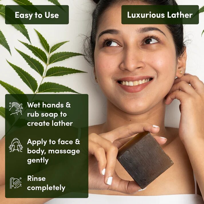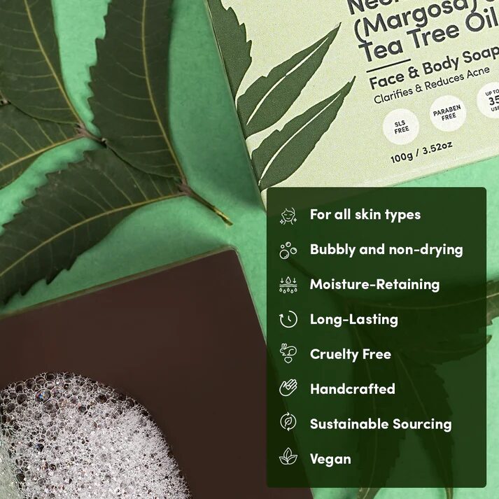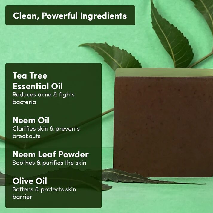 SLS-Free Soap Base, Tea Tree Essential Oil, Neem Oil, Neem Leaf Powder, Coconut Oil, Olive Oil, Castor Oil, Sugar