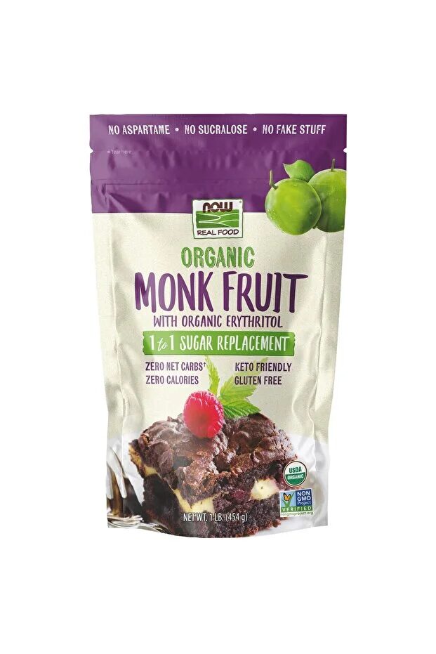 This combination of Organic Erythritol and Organic Monk Fruit from NOW® is a wonderfully sweet way to avoid sugar and all of its calories. Erythritol is a naturally occurring sugar alcohol derived from non-GMO, organic corn, while Monk Fruit Extract, also known as Luo Han Guo, is derived from the concentrated juice of a melon-like, vine fruit native to parts of South Asia. Monk Fruit Extract is up to 200 times sweeter than sugar and has a delightfully vibrant, sweet taste with very little aftertaste. The natural sweetness and zero calories of NOW® Real Food Organic Erythritol with Monk Fruit Sweetener, make it an ideal replacement for refined cane sugar in all your favourite recipes.