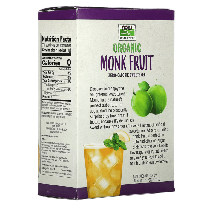 NOW Organic Monk Fruit ZERO-CALORIE Sweetener 70 Packets 70G