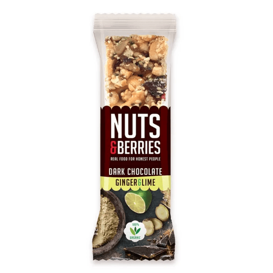 Almonds, Cashew nuts, Dark chocolate (12.5%) (cane sugar, cocoa butter, cocoa mass, vanilla powder), agave syrup, rice syrup, puffed rice, sunflower seeds, ginger (5%), dried limes (0.5%)