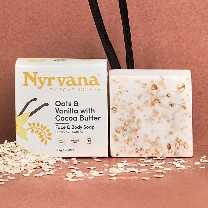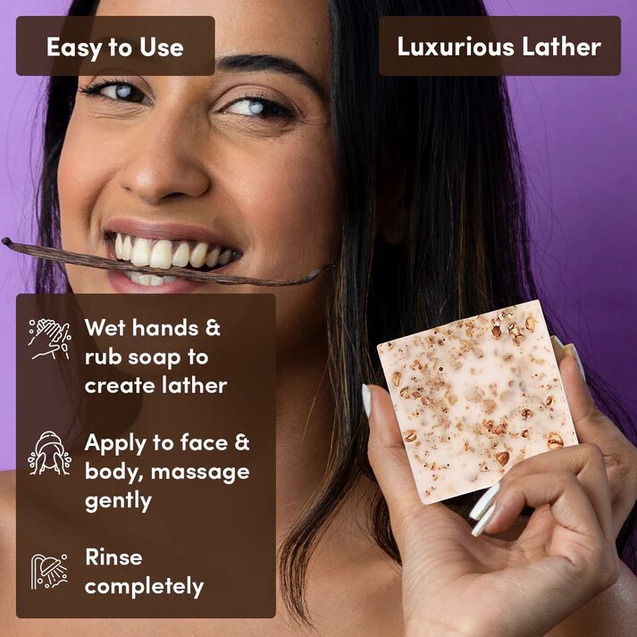 SLS-Free Soap Base, Vanilla Oil, Cocoa Butter, Vanilla Extract, Coconut Oil, Olive Oil, Castor Oil, Sugar, Oats