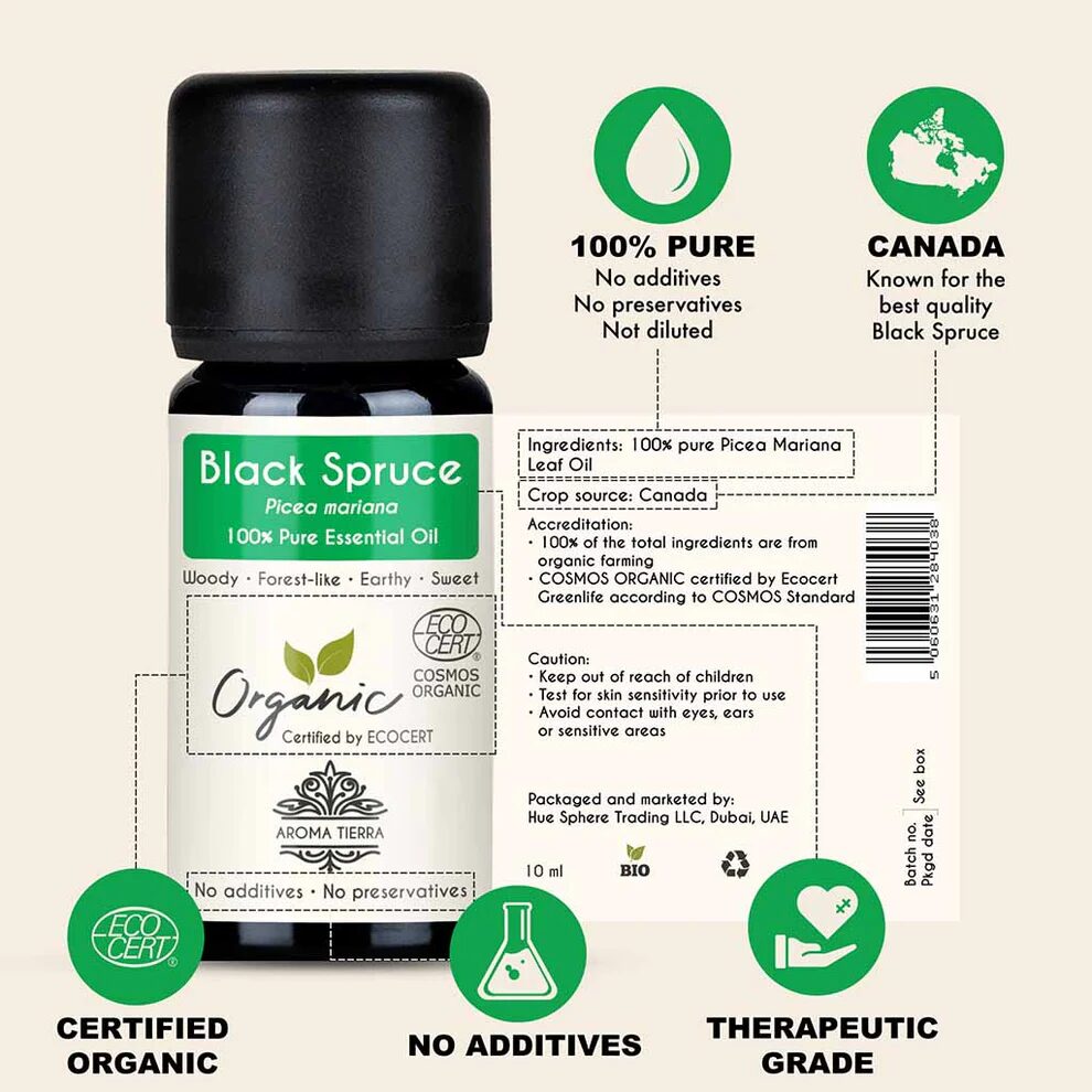 Aroma Tierra Black Spruce Essential oil is 100% pure, natural and undiluted. It is extracted from high quality produce from Russia, by steam distillation of leaves of the Black Spruce tree (Picea mariana). It is free from chemicals, solvents, additives, synthetic fragrances and preservatives. The oil is very concentrated, potent and strong in therapeutic properties. Aroma Tierra takes great care to pack the oil in specially designed violet glass bottle to prevent damage from sunlight and preserve its potency. Aroma Tierra offers a very wide selection of many other Essential oils such as Lavender, Peppermint, Frankincense, Rosemary, Tea Tree, Ylang Ylang, Bergamot, Oregano, Lemon, Thyme, Sweet Orange, etc., from across 35+ countries across 6 continents. With Aroma Tierra Essential oils, you can be assured of quality and potency – the company is very particular to use high quality produce that grows in its most natural climate, and processes it in a way that preserves maximum therapeutic benefits. Ingredients:Pure Black Spruce Essential Oil, How to use (non-exhaustive) Take a whiff from the bottle Add a few drops to the aroma diffuser Add a few drops to your bath or sauna Apply topically – Dilute in a base oil such as fractionated coconut oil or jojoba oil for topical application Add to the steam inhaler or add a few drops to hot water and inhale (cover head with a towel) , Aroma Tierra specializes in oils and is very passionate about bringing the best quality oils to you. We are a notch higher than just being 100% pure & natural. We go an extra-mile to extract the oils from the best quality produce from the country where the crop grows best. Our oils are extracted in 35+ countries e.g., Lemon oil from Italy, Lavender from France, Argan oil from Morocco, and so on. We ensure there are no additives, solvents, chemicals or preservatives in any of our products. Our cold pressing extraction process for face & body oils ensures that delicate nutrients are not destroyed by heat or processing. Our organic range is Certified organic by ECOCERT, an independent reputed certification body from France. We love what we do and are dedicated to bringing the best in nature to your everyday life.