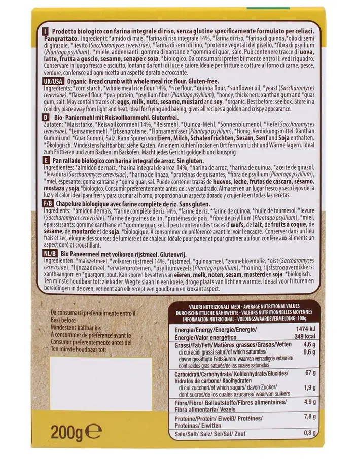 Breadcrumbs with whole meal flour, flax seeds, sunflower seeds and quinoa is an ideal preparation for frying and baking. Guaranteed gluten-free, with a crossed ear in the package and loanable by the National Health System, gluten-free breadcrumbs will allow you to make golden and crunchy breadcrumbs for the whole family, even for those who follow a gluten-free diet. Available in 200g format.