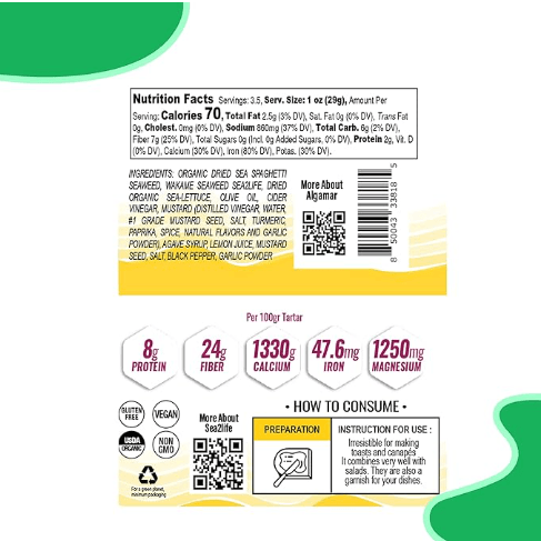 Introducing ALGAMAR Atlantic Seaweed Tartar with Mustard, the perfect addition to any seafood dish! Our tartar is made from sustainably sourced Atlantic seaweed and blended with a tangy mustard for a unique and delicious flavor. It’s a healthy alternative to traditional tartar sauces, as it’s low in calories and high in nutrients. This versatile condiment can be used as a dip for seafood, a spread for sandwiches, or a sauce for fish and vegetables. It’s gluten-free, vegan, and non-GMO, making it suitable for a variety of dietary needs. Try it today and discover the unique taste of seaweed in a whole new way!