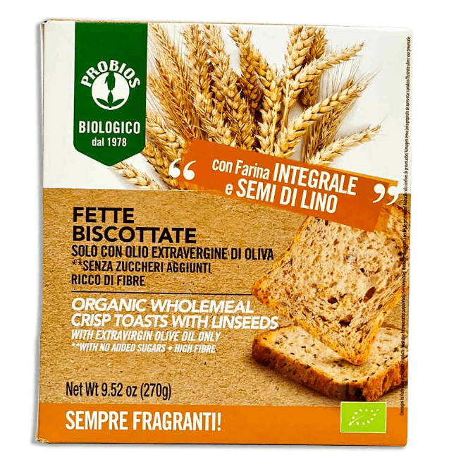 Probios Wholemeal Rusks are made with 100% organic wholemeal flour. The recipe, free of added sugar, is enriched with extra virgin olive oil and offers a high amount of fiber, guaranteeing a genuine and balanced product. Thanks to a slow drying process of at least 20 hours, a perfect crunchy texture is achieved. Enjoy them for breakfast with jam or spreads, or combine them with savory ingredients for a nutritious and delicious snack. Discover all the other variants of the line: wholemeal spelt, white flour, wholemeal with flax seeds, with cereals, without salt and with kamut.
