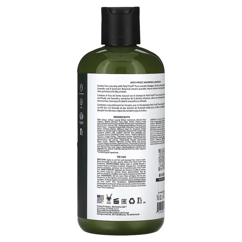 Combat frizz naturally with Petal Fresh® Pure Lavender Shampoo (Anti-Frizz). The frizz-eliminating blend of Certified Organic Lavender and 8 premium Botanical extracts provides intense moisture and tames coarse textures, leaving hair ultra-polished and silky smooth.