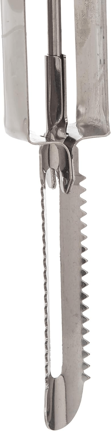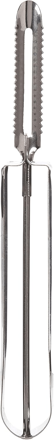 Swiveling twin blades with flexible action easily peel potatoes, apples and other tough skinned fruits and vegetables