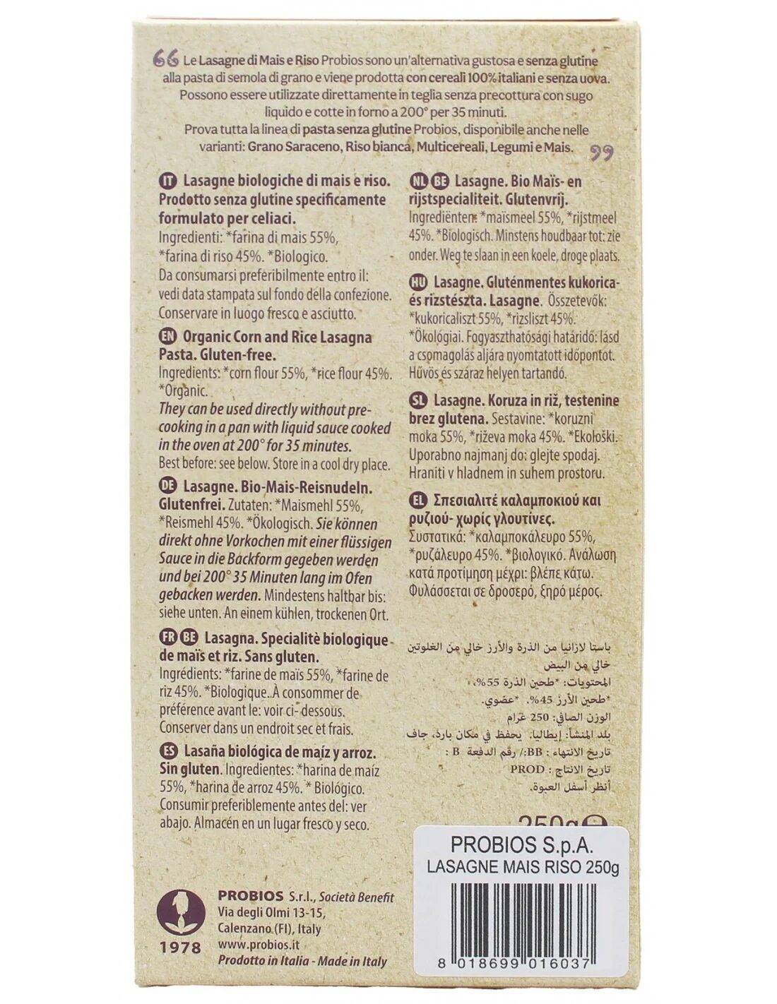 Probios Corn & Rice Lasagna is prepared with only fresh ingredients and contains no preservatives. It is also a great source of vitamin B1, vitamin B2, niacin and iron. Contains no artificial colors and is made with naturally sourced ingredients * 39% protein.