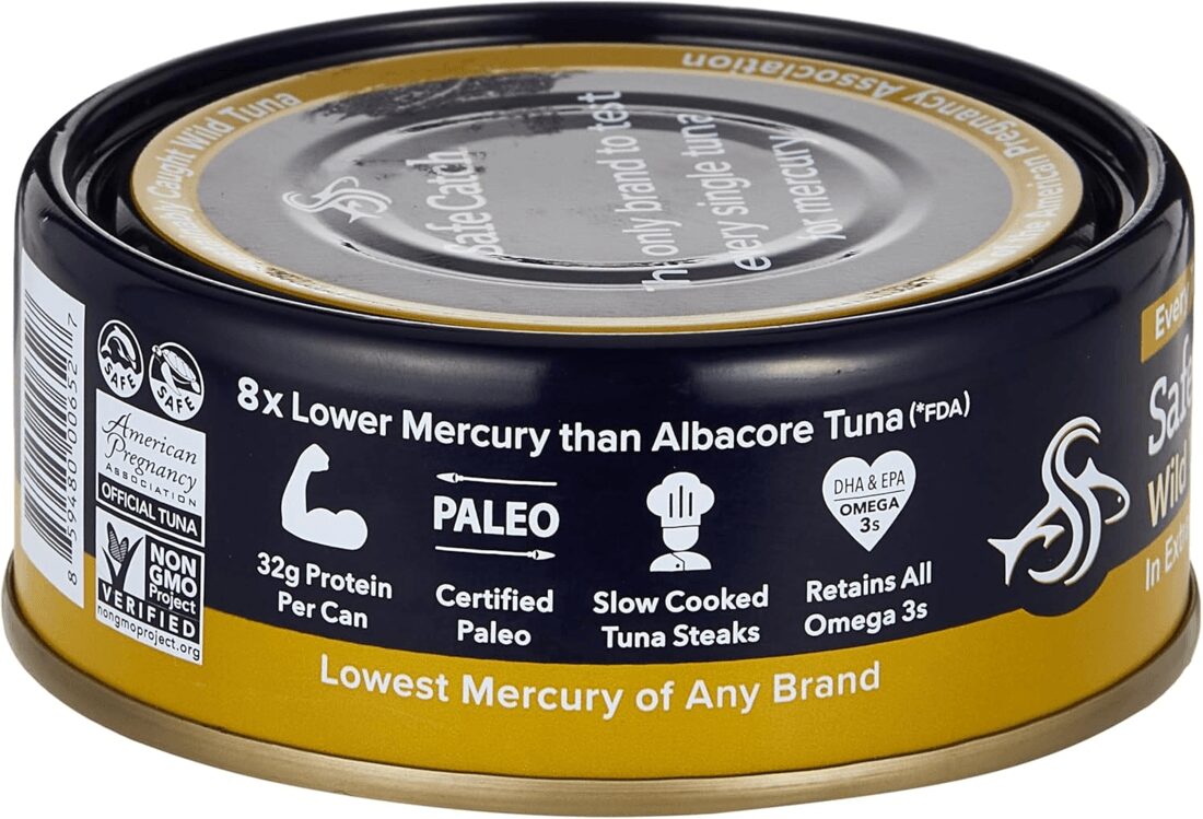 Safe Catch’s Wild Ahi Yellowfin Tuna in extra Virgin Olive oil. Ahi is one of our lowest mercury tunas.