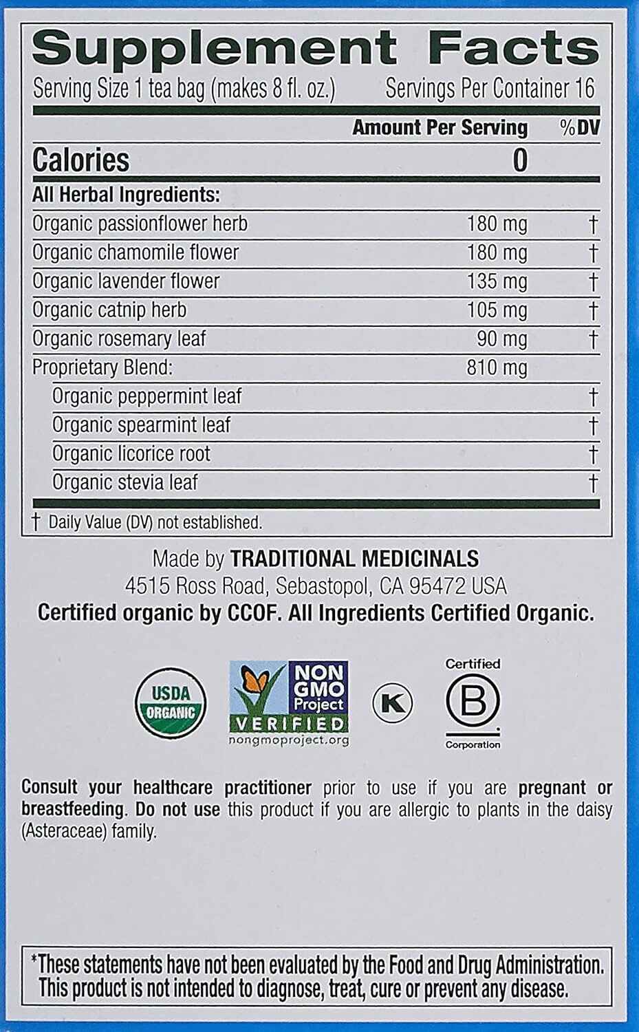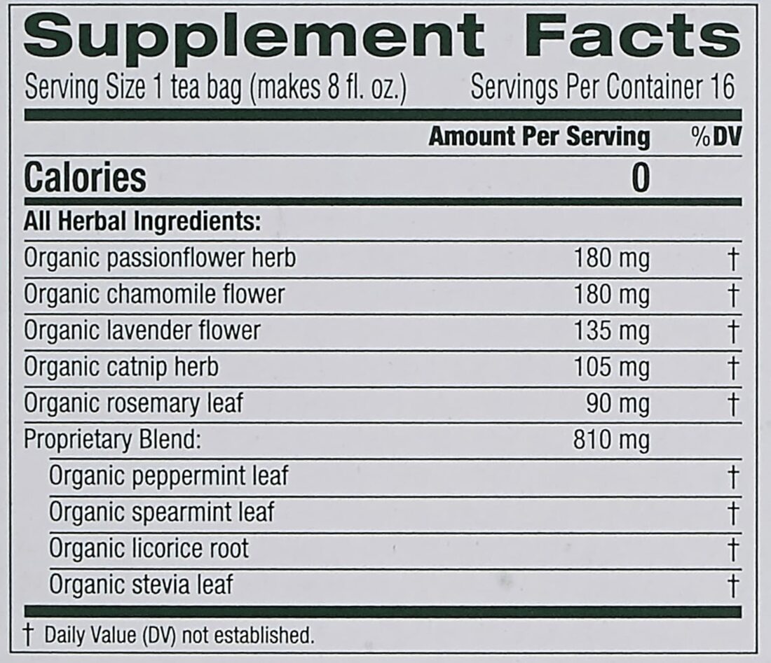 Organic passionflower herb, organic chamomile flower, organic lavender flower, organic catnip herb, organic rosemary leaf, organic peppermint leaf, organic spearmint leaf, organic licorice root, organic stevia leaf.