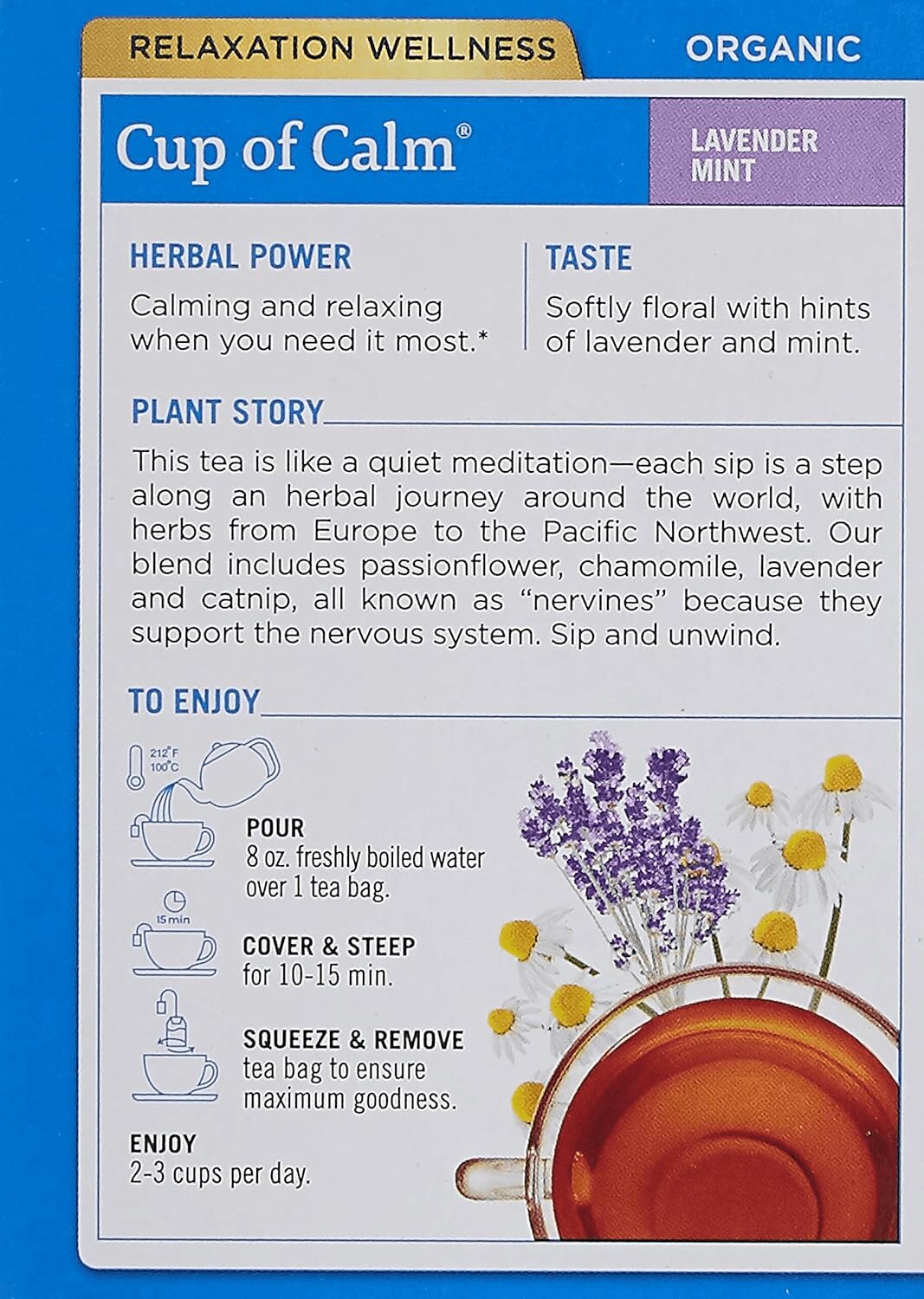 All Ingredients Certified Organic. Herbal Power. Calming and relaxing when you need it most. Taste. Softly floral with hints of lavender and mint. Plant Story. This tea is like a quiet meditation – each sip is a step along an herbal journey around the world, with herbs from Europe to the Pacific Northwest.