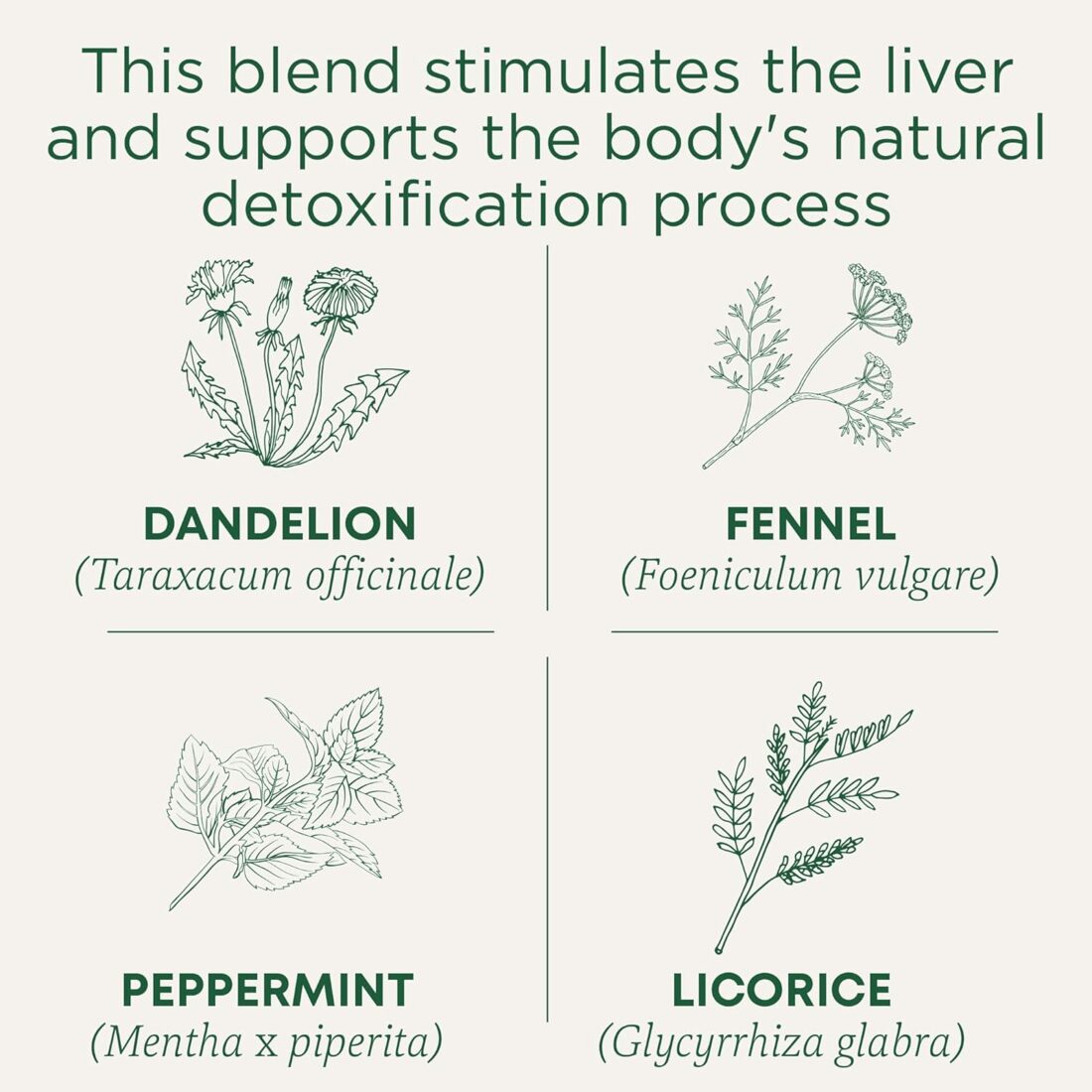 Organic dandelion herb with root, Proprietary blend: Organic fennel fruit, Organic peppermint leaf, Organic licorice root.