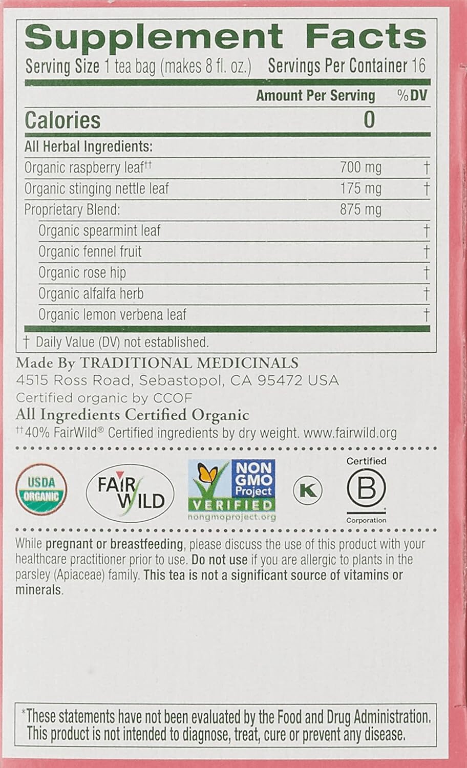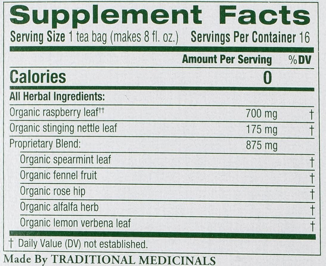 Organic Red Raspberry Leaf, Organic Nettle Leaf, Organic Peppermint Leaf, Organic Lemon Balm Leaf, Organic Ginger Root, Organic Dandelion Leaf