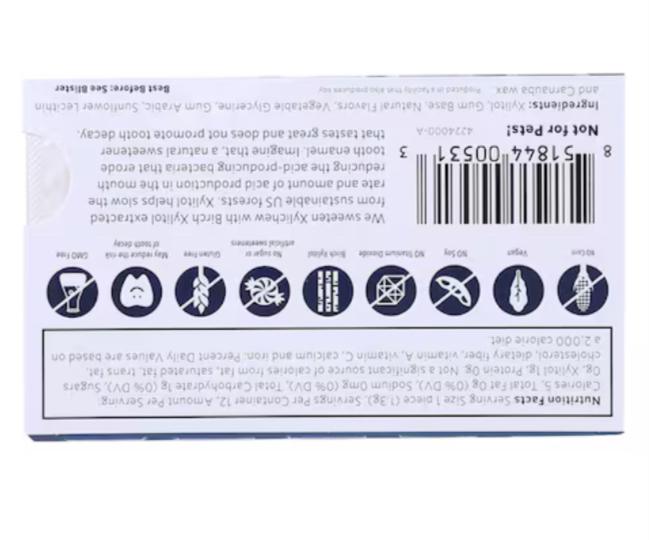 Xylitol, Gum base, Vegetable glycerin, Natural flavors, Gum arabic, Sunflower lecithin, and Cranoba wax