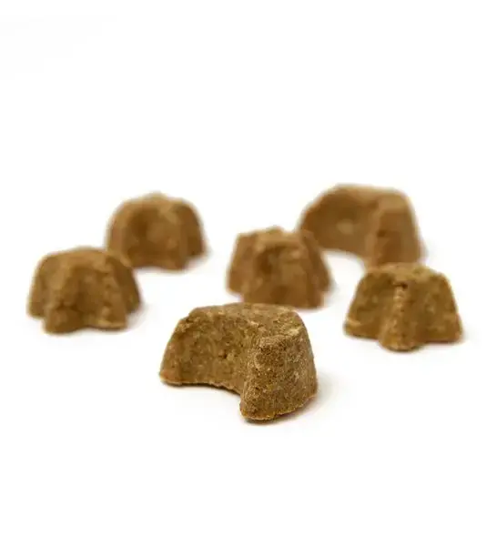 Oats, chickpea flour, dehydrated insect protein (Hermetia Illucens – black soldier fly, 20%), rapeseed oil, dried apple, spinach (2%), honey (2%), minerals, passiflora & anthemis nobilis (roman chamomile) (0,5%), valerian root (0,5%), lemon balm (0,5%).